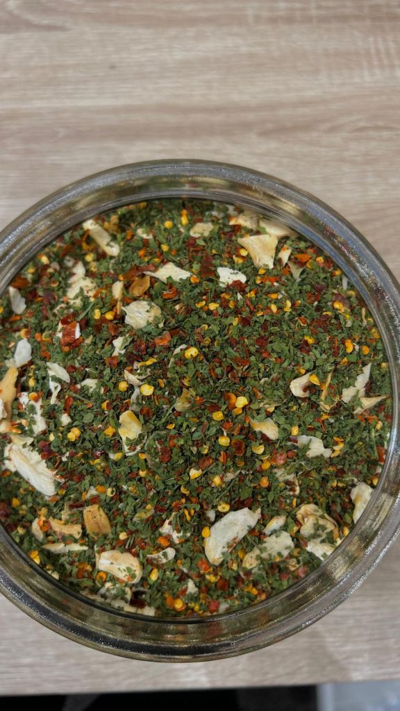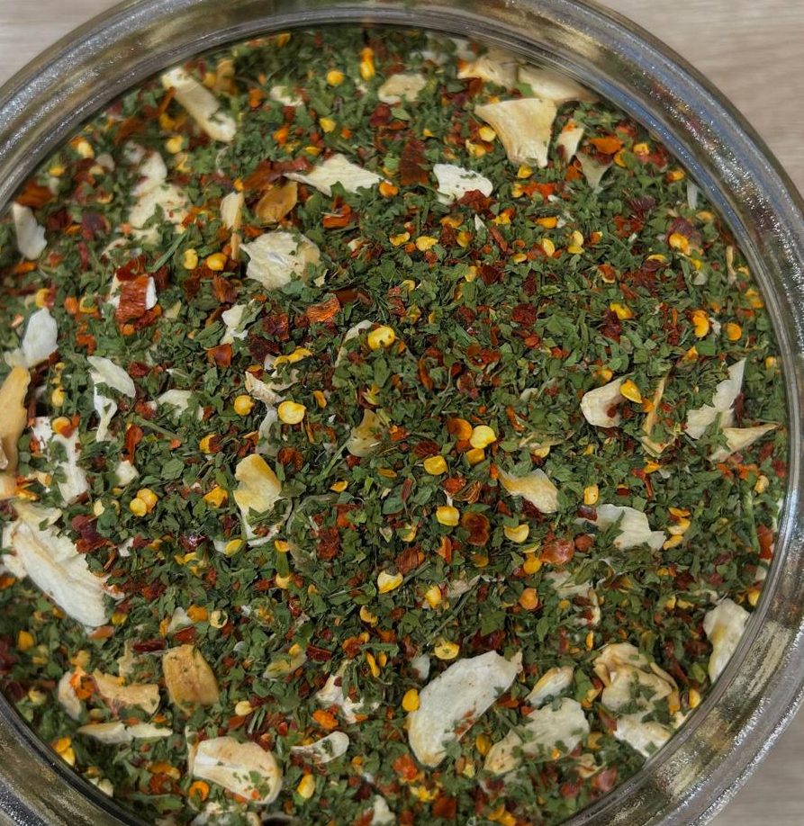 Questo mix naturale racchiude le proprietà benefiche di tre ingredienti preziosi: l’aglio, noto per le sue virtù depurative e antibatteriche; il peperoncino, ricco di capsaicina e antiossidanti, che stimola il metabolismo; e il prezzemolo, fonte di vitamina C, ferro e clorofilla. Insieme contribuiscono a una cucina saporita ma equilibrata, favorendo il benessere e il gusto senza eccessi di sale o grassi.